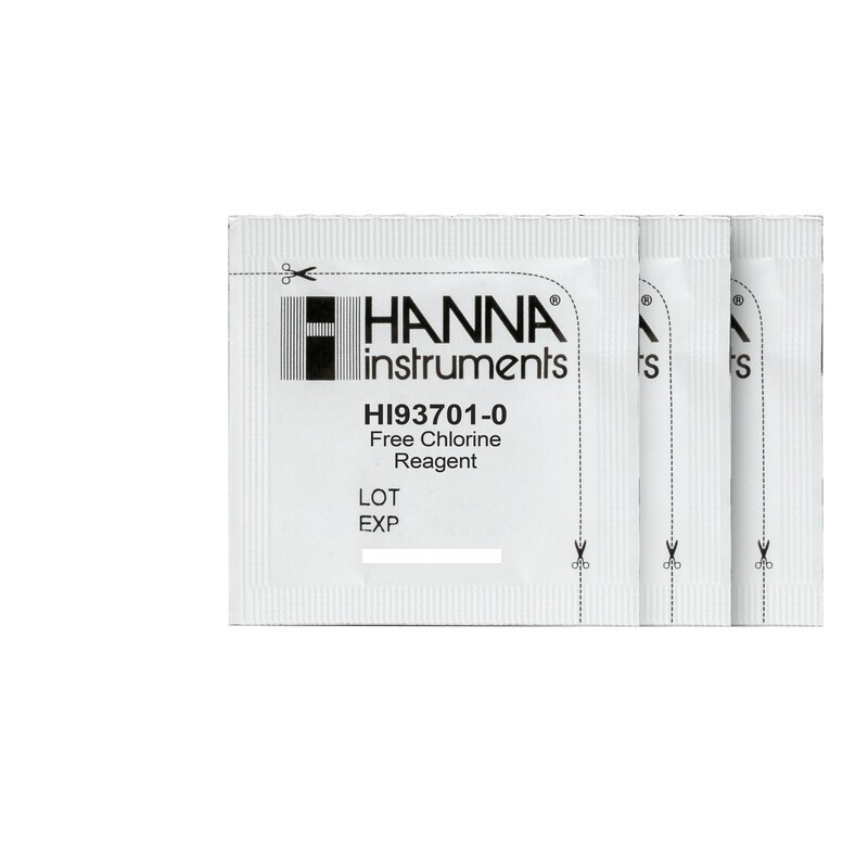 The HI-93701-01 are high quality reagents that are pre-measured, allowing for users to achieve fast and accurate colorimetric measurements. These reagents follow the DPD Method in which the reaction between chlorine and reagent causes a pink tint in the sample. The intensity of colour is determined by a compatible photometer and the concentration will be displayed. The results will be display the concentration of chlorine in mg/L (ppm). These reagents are designed to be used with samples that have an expected range of 0.00 to 5.00 mg/L free chlorine.