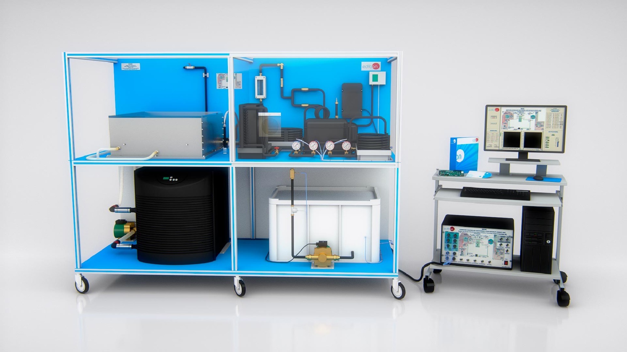 The Computer Controlled Geothermal (low enthalpy) Energy Unit, "EG5C", designed by EDIBON, consists of a cooling circuit, a small tank with pipes covered with water (bath) and a chilling unit (heat pump). The inside of the earth is simulated with them. There is another tank where the sanitary hot water heated bythe unit is stored.