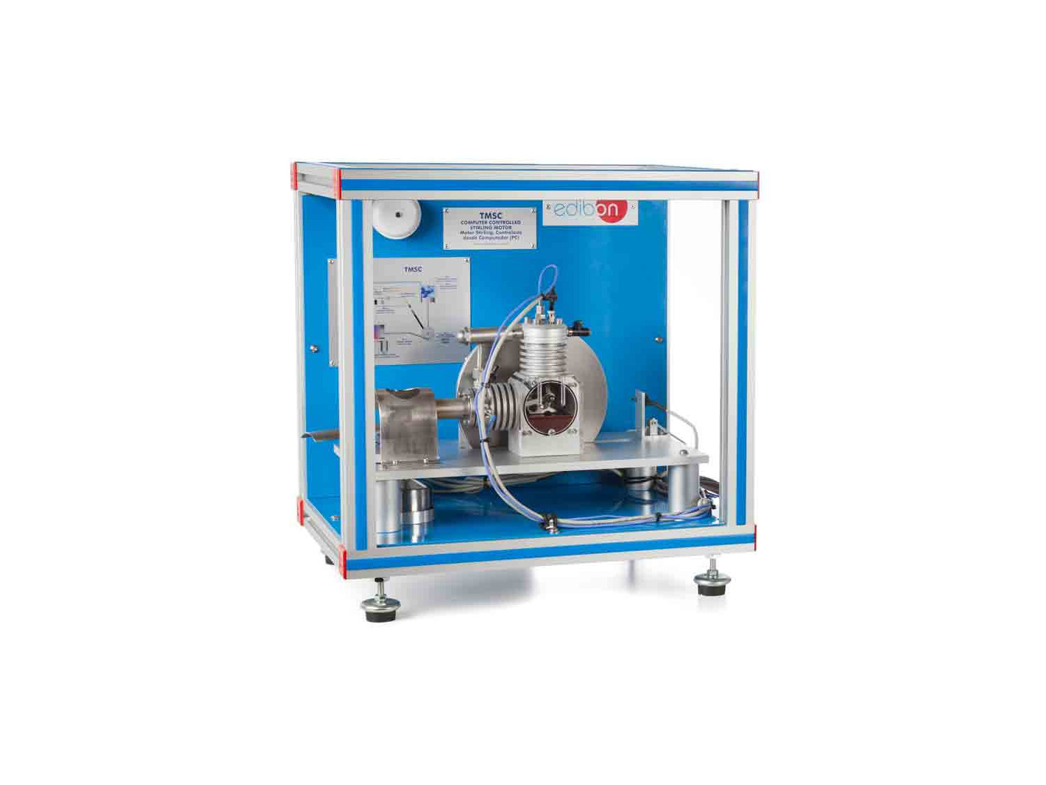 The Computer Controlled Stirling Motor, "TMSC", unit designed by EDIBON is an Alfa type engine. It consists of two power pistons located in separate cylinders (one for the cold source and another for the hot one). They are connected to a tube where the regenerator is located, which stores and transfers the heat, that enables the engine to reach a higher efficiency.